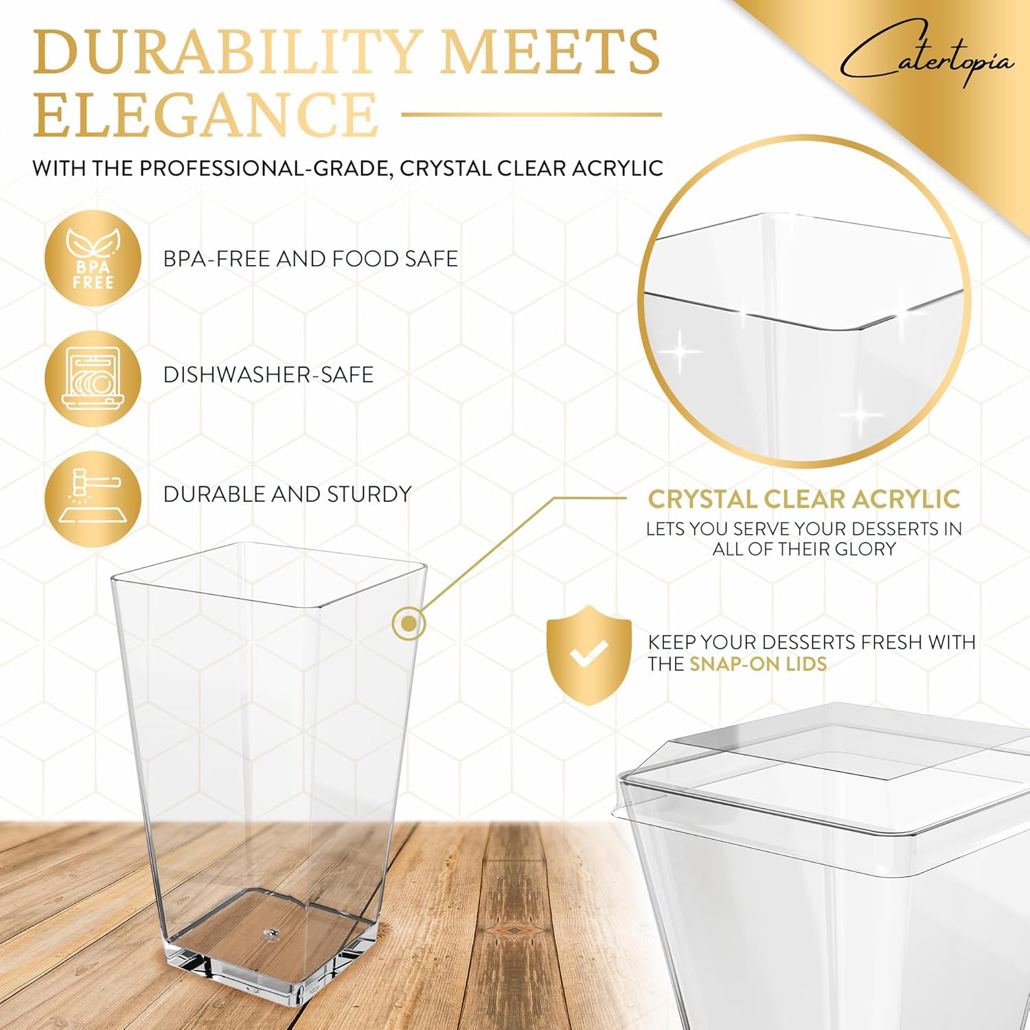 - THE ULTIMATE VALUE PACK that comes with 100 acrylic dessert cups, 100 acrylic lids and 100 golden spoons to serve each and every guest in style. Add to Cart now for a pack of luxury 3 ounce mini trifle cups that’ll blow your guests away!