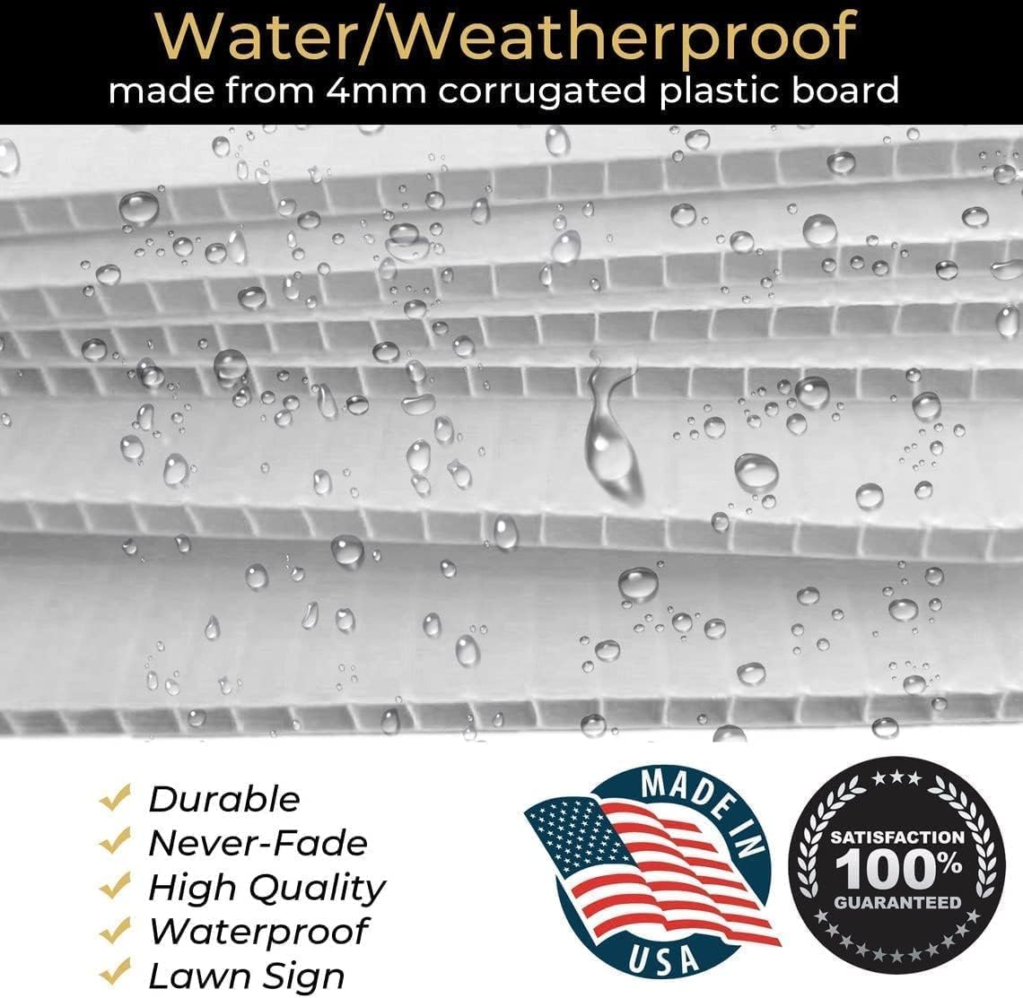 - [Sturdy yard sign]: These personalized yard signs are constructed with weatherproof corrugated plastic sign material, a premium corrugated plastic that will endure practically any weather condition while staying vibrant, colorful, and unharmed.
