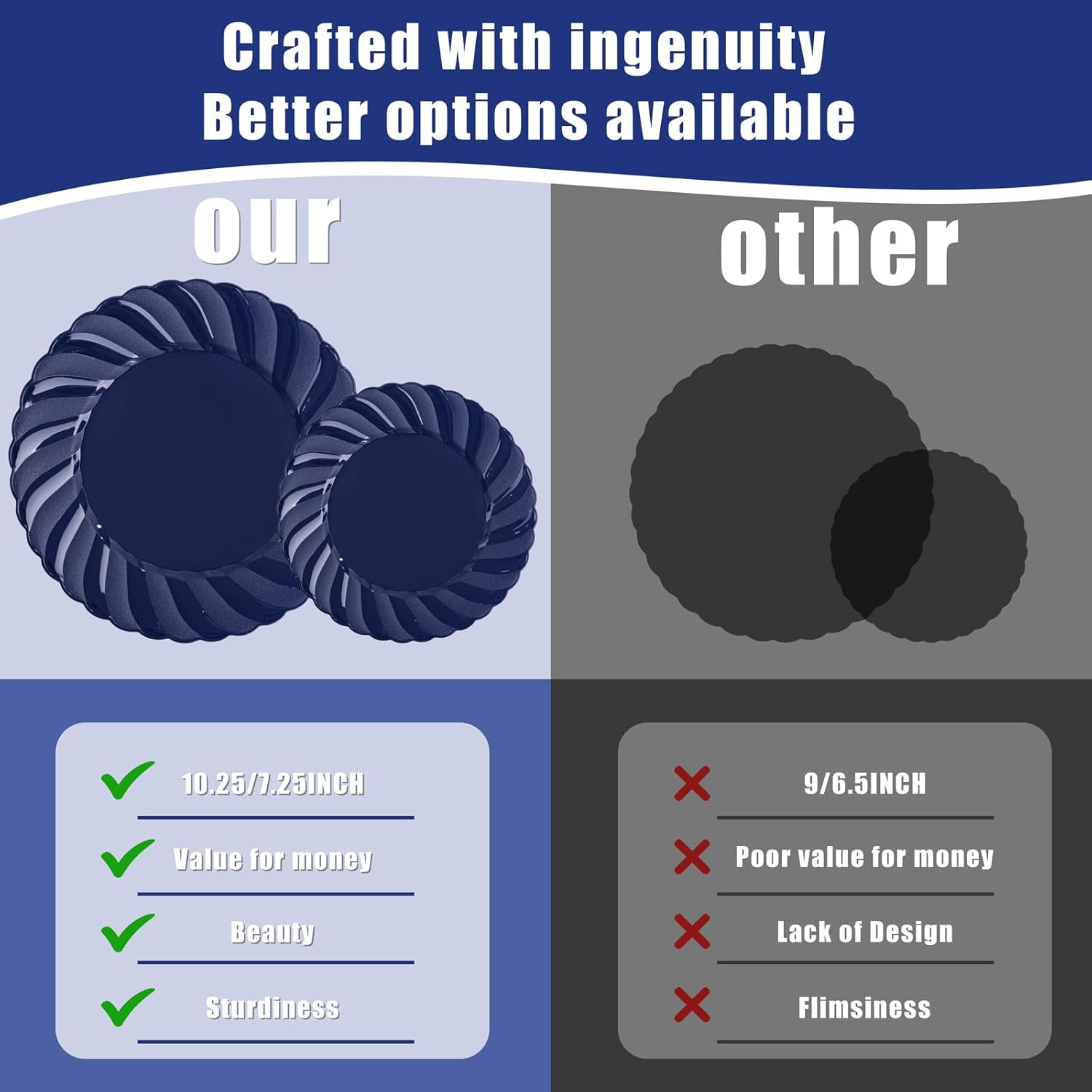 - Fancy scalloped design: Different from the monotonous shapes of ordinary plastic plates on the market, this blue plastic plates adopts a scalloped edge design. The overall style is simple and elegant with a luxurious touch. The classic navy blue color can easily blend into various dining table settings and is suitable for different decoration styles such as retro, modern, and fresh, completely solving the problem of "stiff design and poor scene adaptability" of ordinary plates, adding an elegant atmosphere to the dining moment.