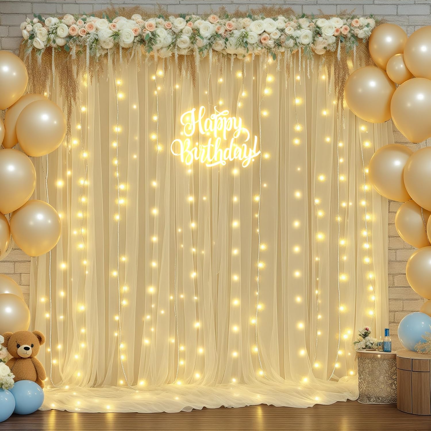- Champagne Sheer Backdrop Curtain with Lights Occasions: Perfect for weddings, baby showers, bridal showers, birthday parties, anniversaries, New Year celebrations, family gatherings, and other occasions to create a memorable photo backdrop. The tulle backdrop curtains can be reused many times. For a fuller effect, consider purchasing multiple sets to use together