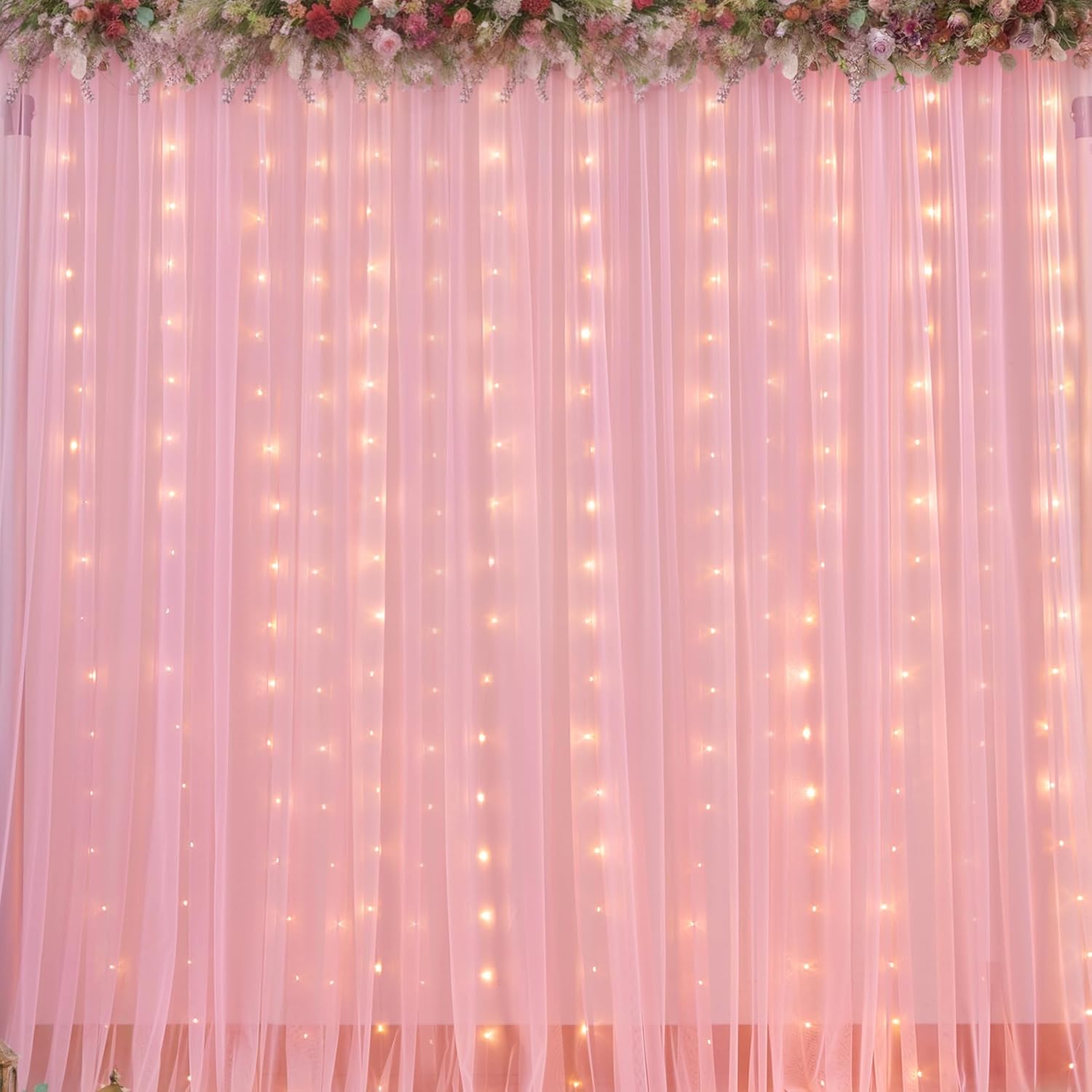 - Pink Sheer Backdrop Curtain with Lights Occasions: Perfect for weddings, baby showers, bridal showers, birthday parties, anniversaries, New Year celebrations, family gatherings, and other occasions to create a memorable photo backdrop. The tulle backdrop curtains can be reused many times. For a fuller effect, consider purchasing multiple sets to use together
