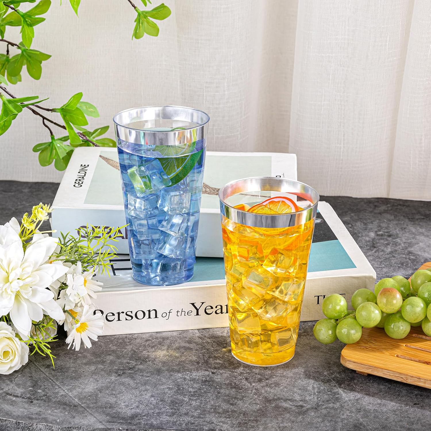 I00000 16 oz Silver Plastic Cups, 50 Pack Clear Plastic Cups,Silver Rimmed Disposable Cup, Heavy-duty Disposable Tumblers Perfect for Party, Holiday, Wedding & Birthday