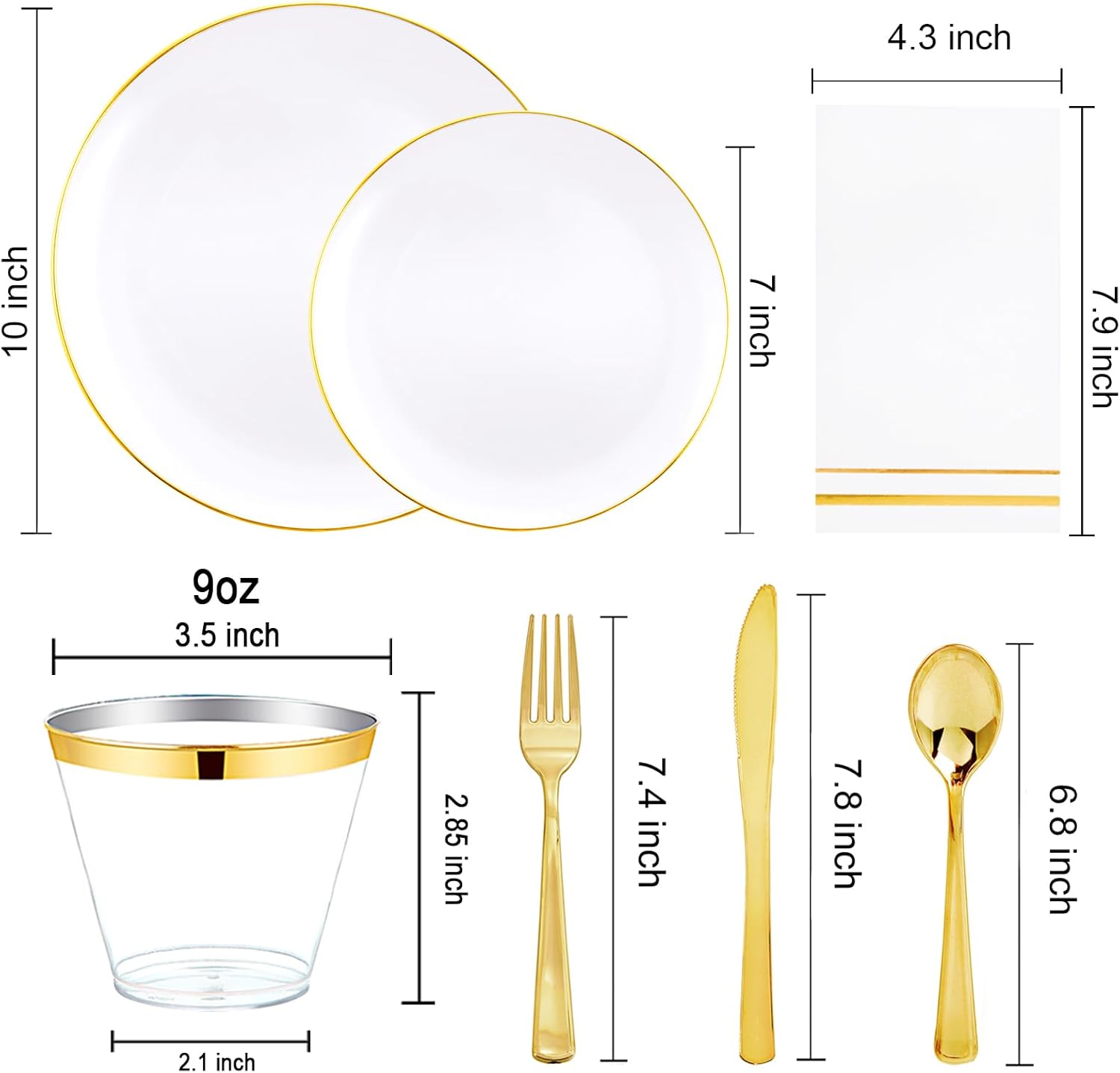 - ALL-IN-ONE 50-GUEST PARTY SET:The gold dinnerware sets include 50pcs dinner plates (10"), 50pcs dessert plates (7"), 150pcs gold silverware 50pcs napkins, and 50pcs cups—everything needed for weddings, birthdays, or summer barbecues. No more mismatched utensils or last-minute runs to the store!