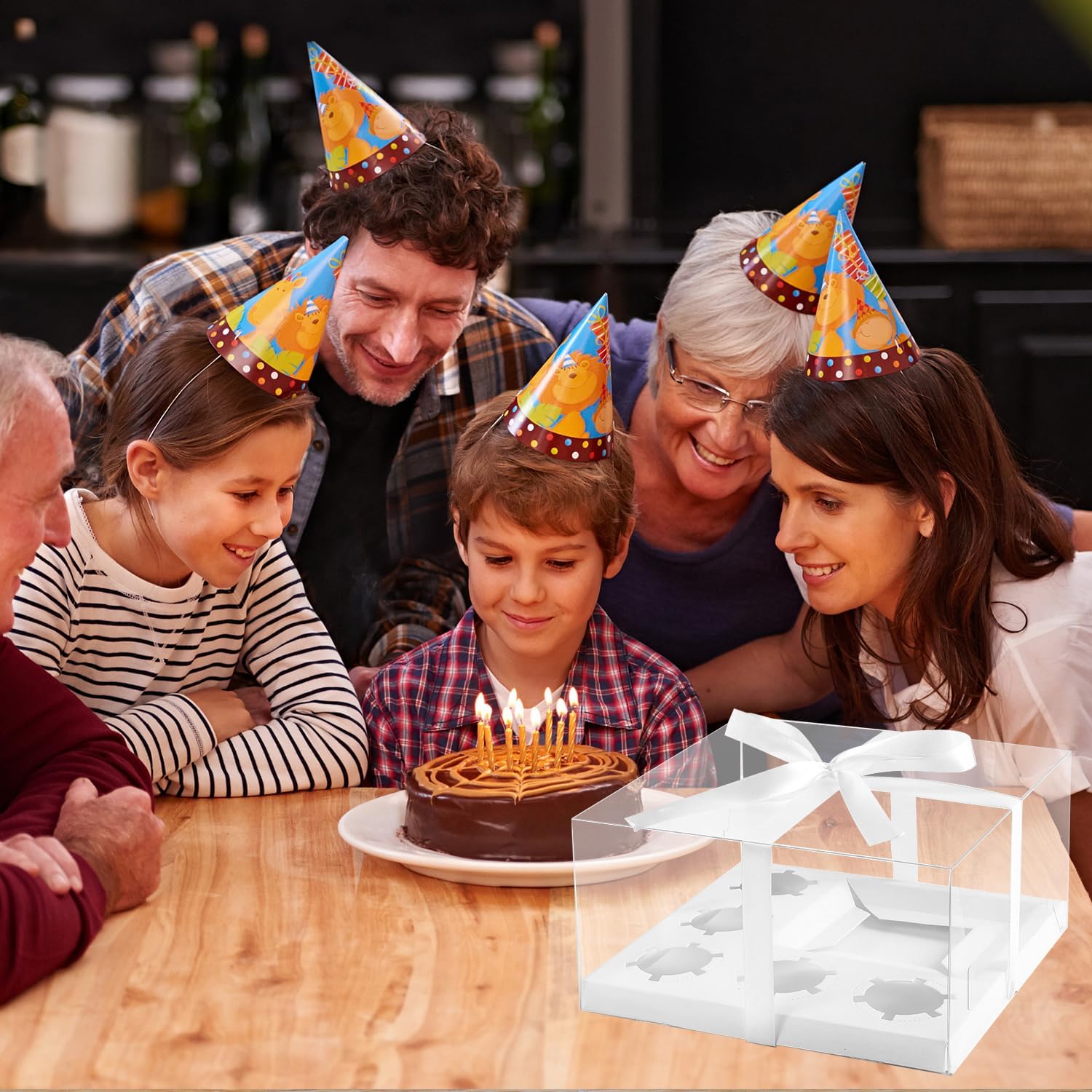 - Package Includes:9pcs clear cupcake boxes + 9pcs inserts + 1 roll ribbon.The paper inserts keep the cupcakes stay in place from moving around. The cake box has a wide viewing angle, perfect for showcasing cakes while protecting them. It is a great choice for making cupcakes and pastries.