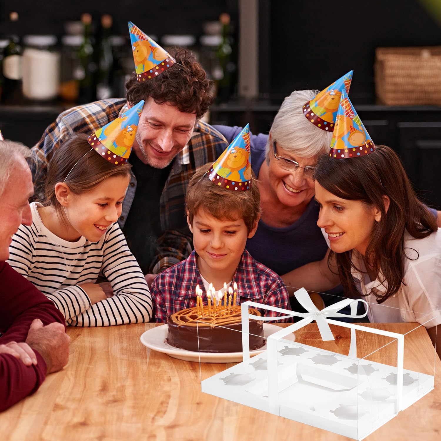 - Package Includes:9pcs clear cupcake boxes + 9pcs inserts + 1 roll ribbon.The paper inserts keep the cupcakes stay in place from moving around. The cake box has a wide viewing angle, perfect for showcasing cakes while protecting them. It is a great choice for making cupcakes and pastries.