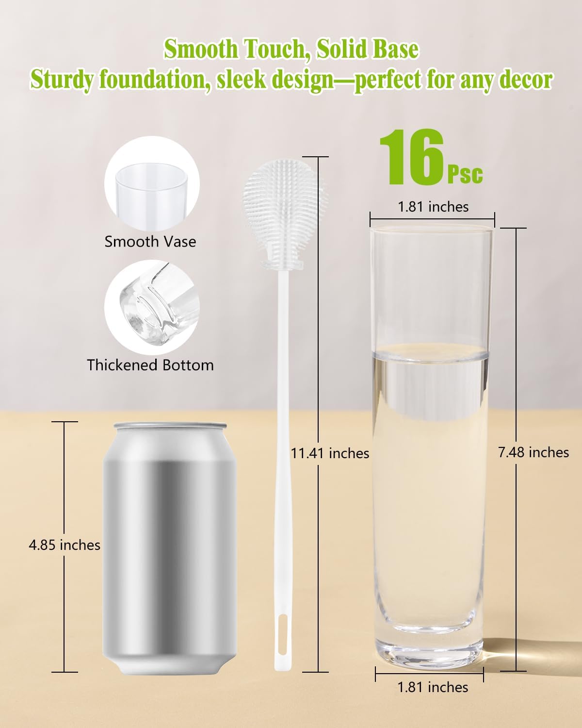 - Glass Cylinder Vases: This set includes 16 high-quality vases for centerpieces. Standing at 7.48 inches tall, with a 1.81-inch mouth and 1.81-inch base, these clear vases offer a minimalist, timeless design perfect for any occasion, with 1 cleaning brush included
