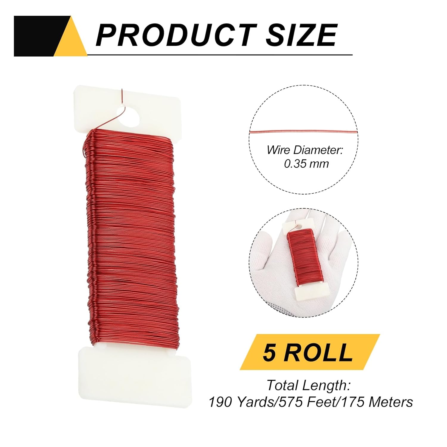 - Color: Red; Material: Aluminum; Total Length: 190 Yards/575 Feet/175 Meters; Diameter: 0.35mm/27 Gauge; In the package of: 5 Roll Metal Floral Wire (38 Yards/ Roll)