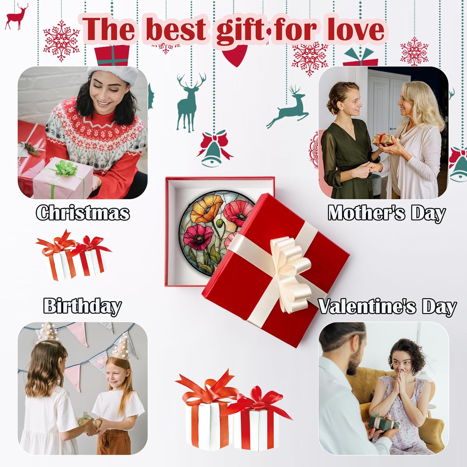 Stained Glass Suncatcher, Red Orange Poppy Flowers Sun Catcher Silver Background Wildflowers Window Hanging Decor Christmas Mother Birthday Gifts for Women Men Mom Nana 6.3 in