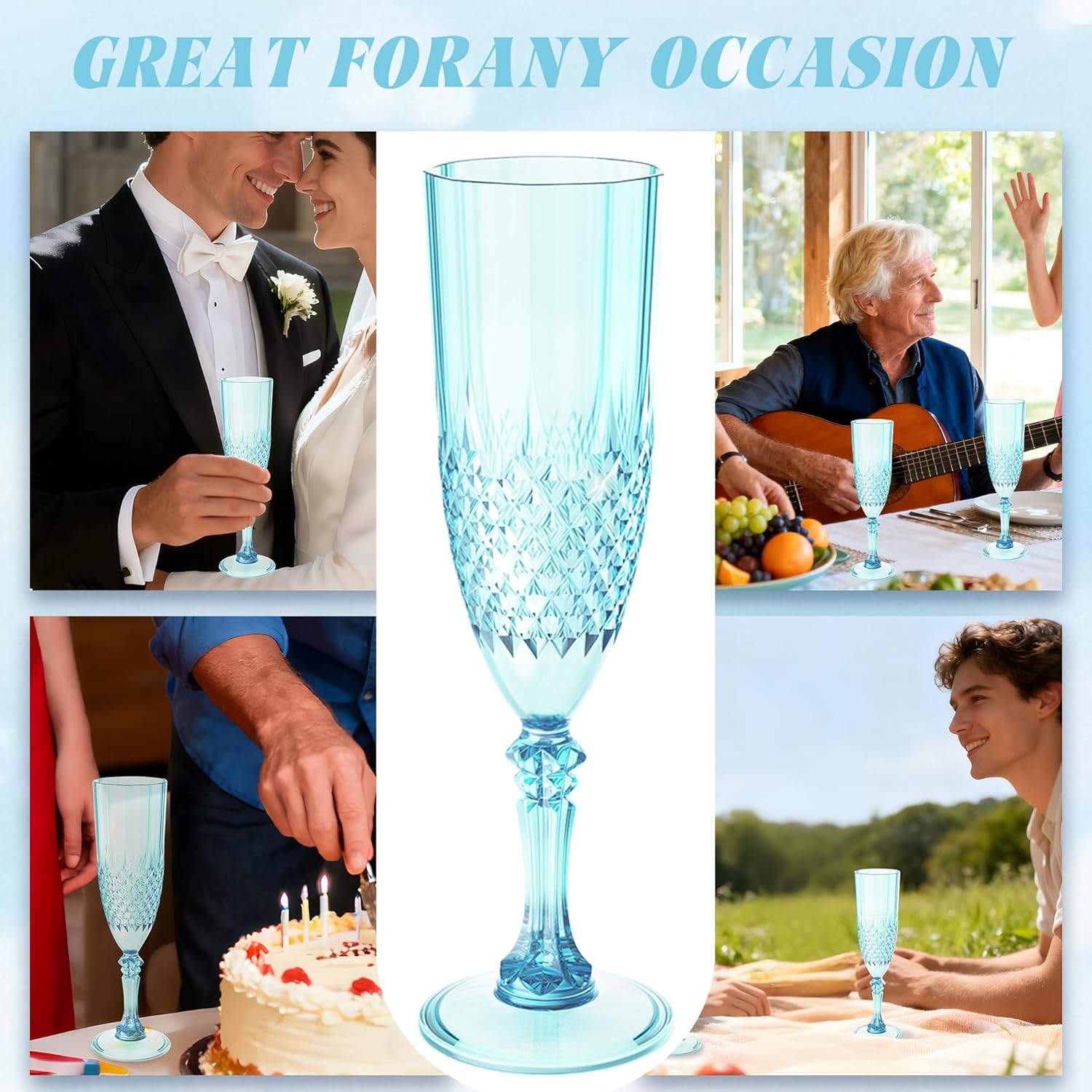 - Charming Set: Champagne flutes set include 48 retro-style light cyan blue champagne plastic wine glasses, providing ample quantity to meet your daily use and replacement needs. A suitable champagne cup is the icing on the cake. Plastic wine glasses not only carry the wine, but also carries the laughter and blessings