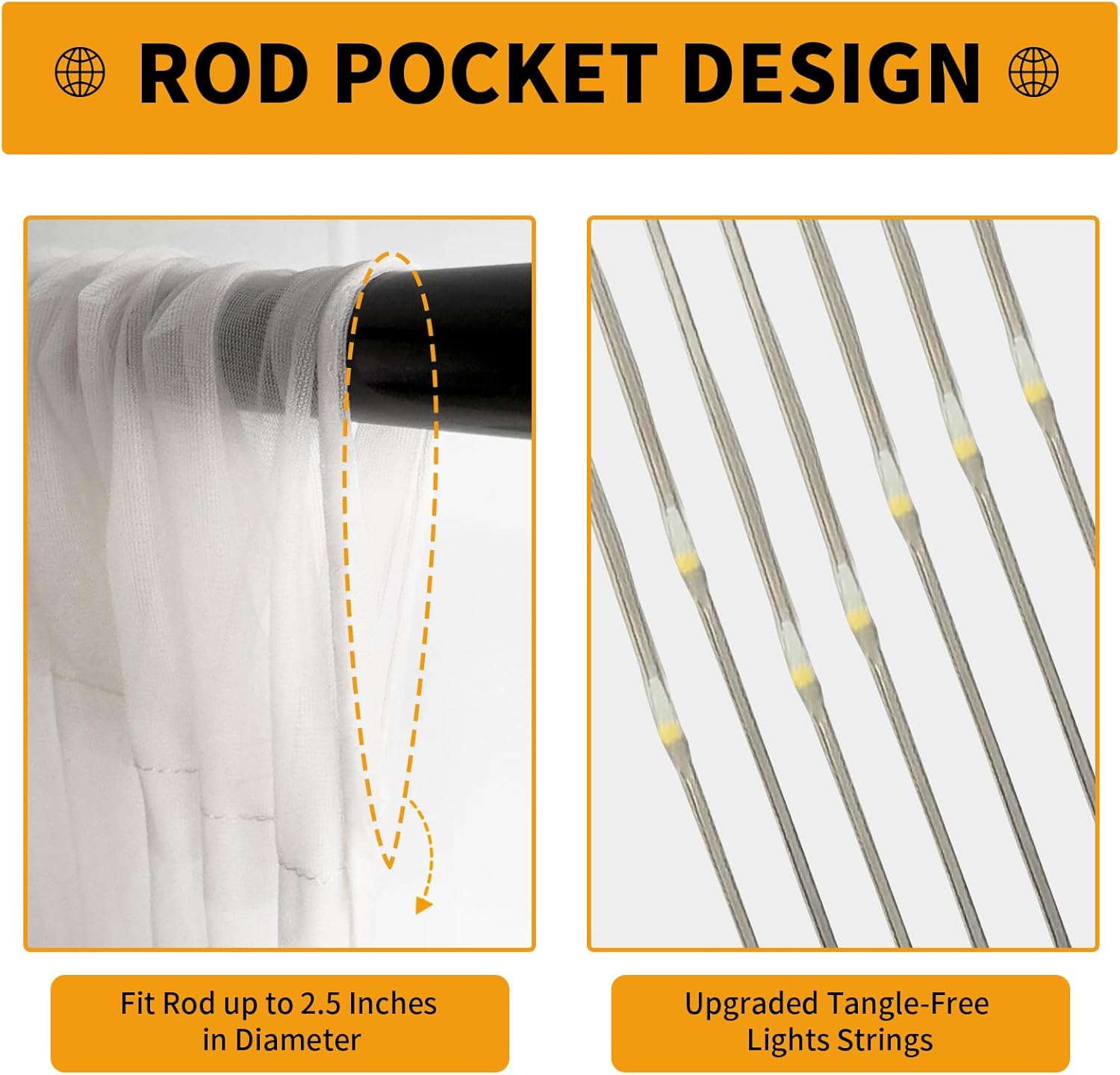 - Quick Setup in 3 Steps: 1. Hang curtains via rod pocket on any pipe/stand. 2. Attach lights using included clips before untying strands. 3. Plug USB into power bank/wall outlet – instant warm glow and choose from 8 lighting modes to create a romantic and magical atmosphere for any occasion! Tangle-free design saves 70% setup time