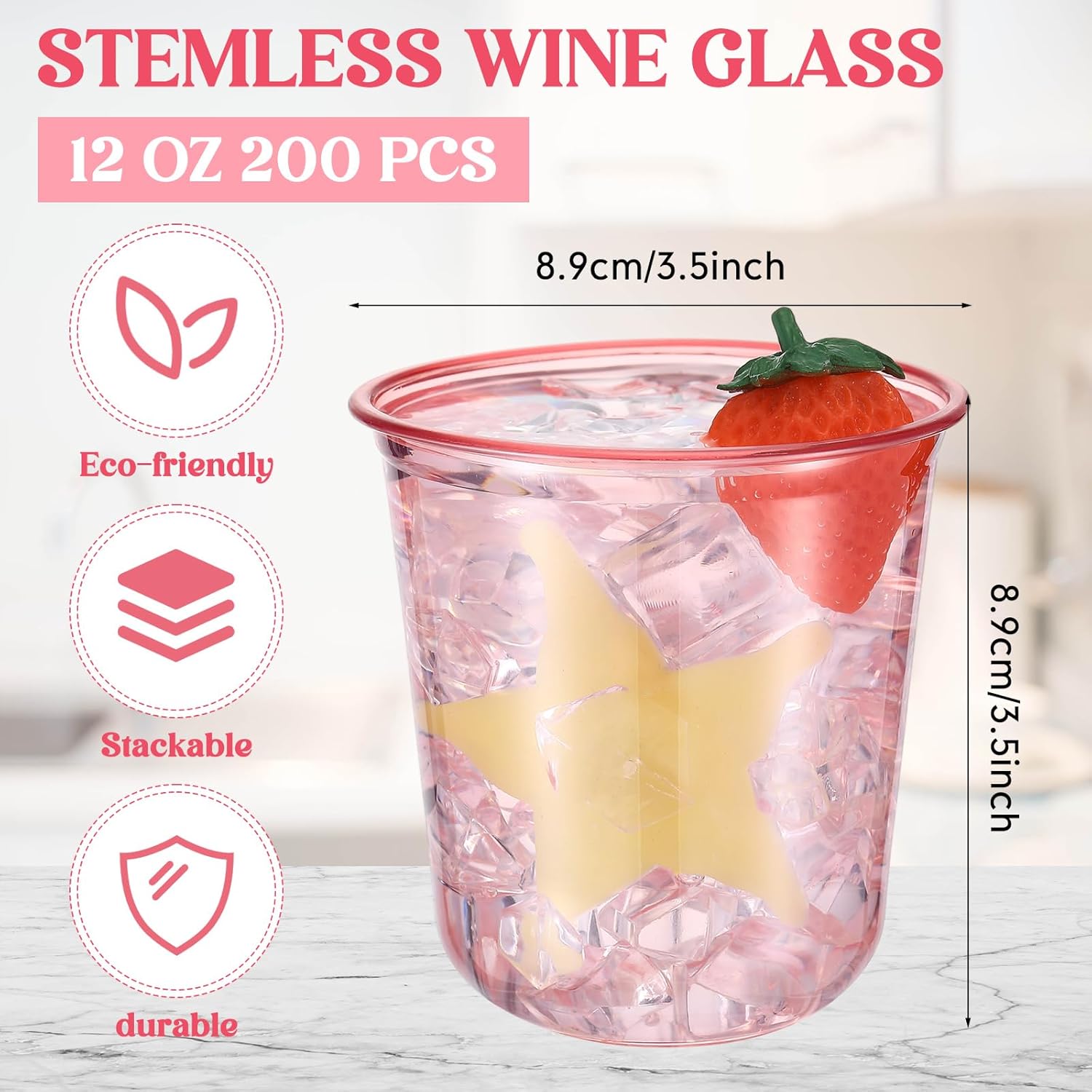200 Pcs Disposable Stemless Glasses 12oz Crystal Plastic Wine Glasses Clear Classic Pet Cup for Meeting Weddings Birthdays Cocktail Christmas Party Supplies (Pink)
