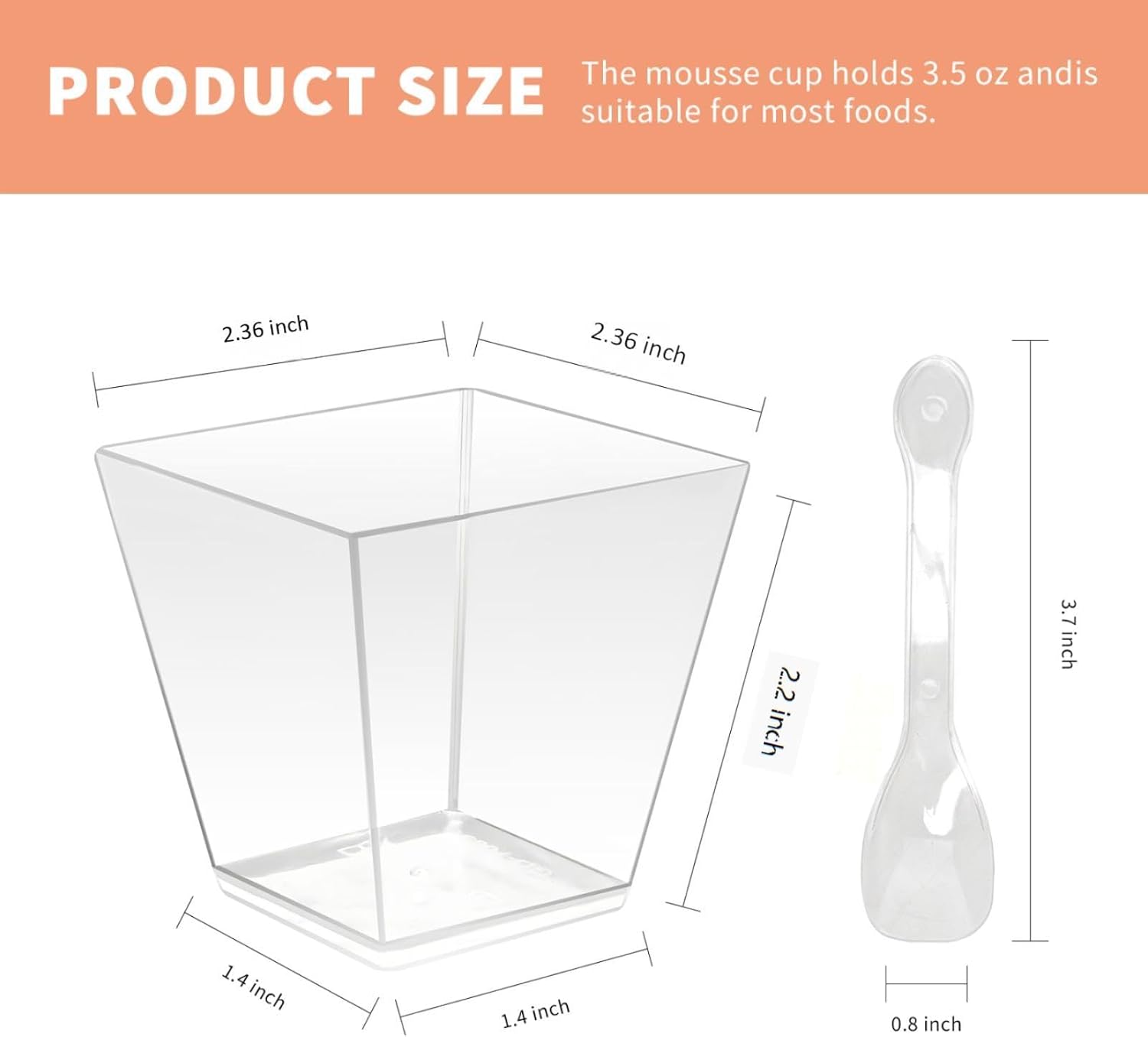 - You will receive 50 pcs 3.5 oz clear square dessert cups and 50 pcs clear spoons,they are made of high quality hard plastic material,heavy duty,durable and lightweight,not easy to break.