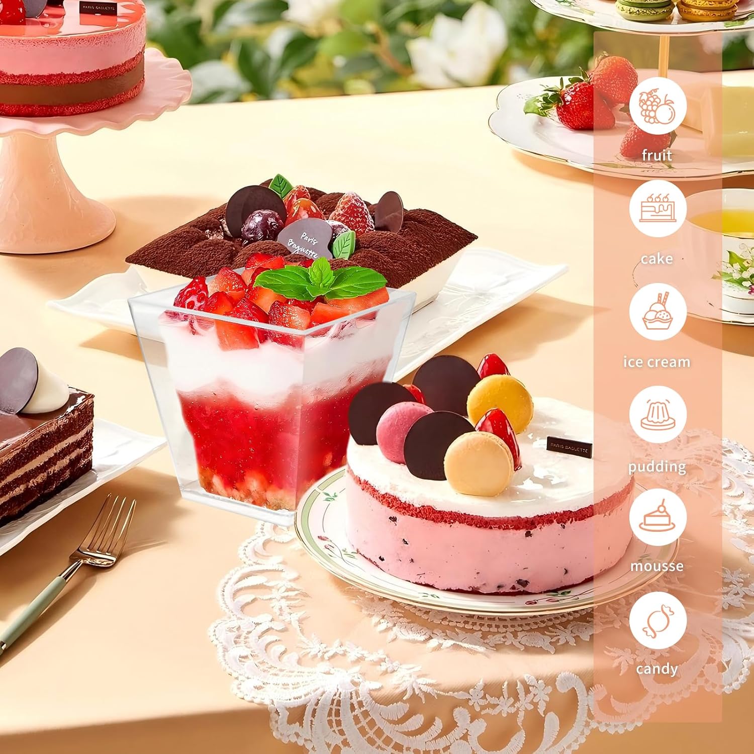 - The dessert cups with spoons are great for birthday party, wedding, graduation, baby shower, bridal shower, reception, catering event, picnic, bake sale and so on.