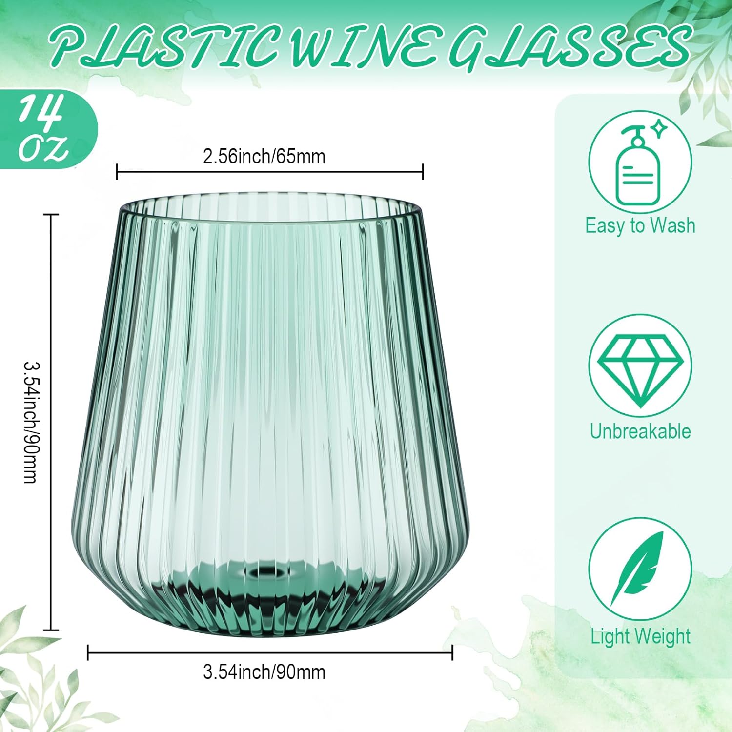 Suclain 50 Pcs Plastic Wine Glasses Ribbed Stemless Wine Glasses 14oz Vertical Design Unbreakable Cups for Outdoor Indoor Vintage Elegant Champagne Whiskey Cups for Party Wedding (Green)