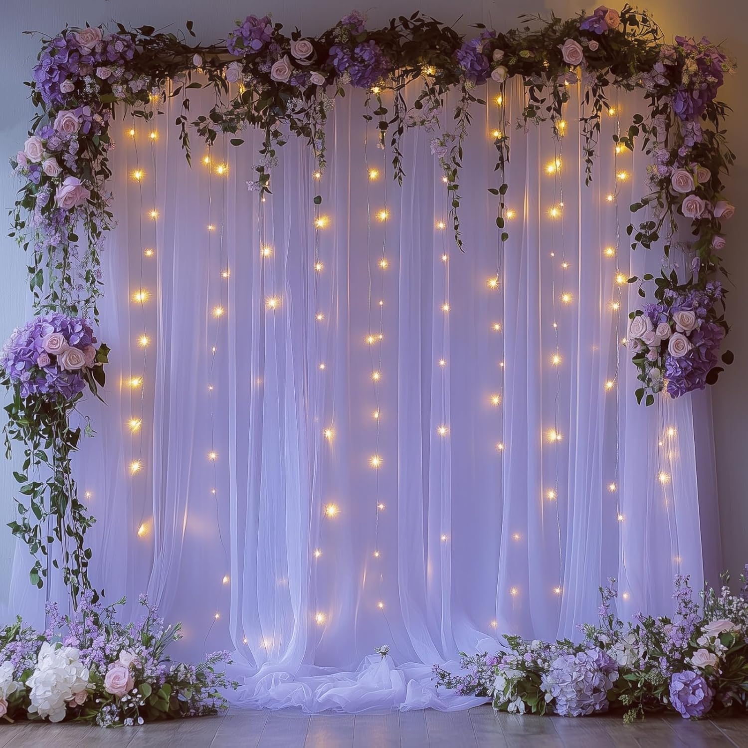 - Elegant Combination of Tulle Backdrop Curtains and Lights - Package Includes: 2 panels lavender sheer tulle backdrop curtains (5ft x8ft each, total 10x8ft).1 set of a 10x8.2ft warm white USB-powered tangle-free string lights (10 strands with 250 LEDs). 12 Transparent clips for hassle-free Installation. (Pro Tip: Buy multiple sets for fuller coverage and reduced sheerness!)