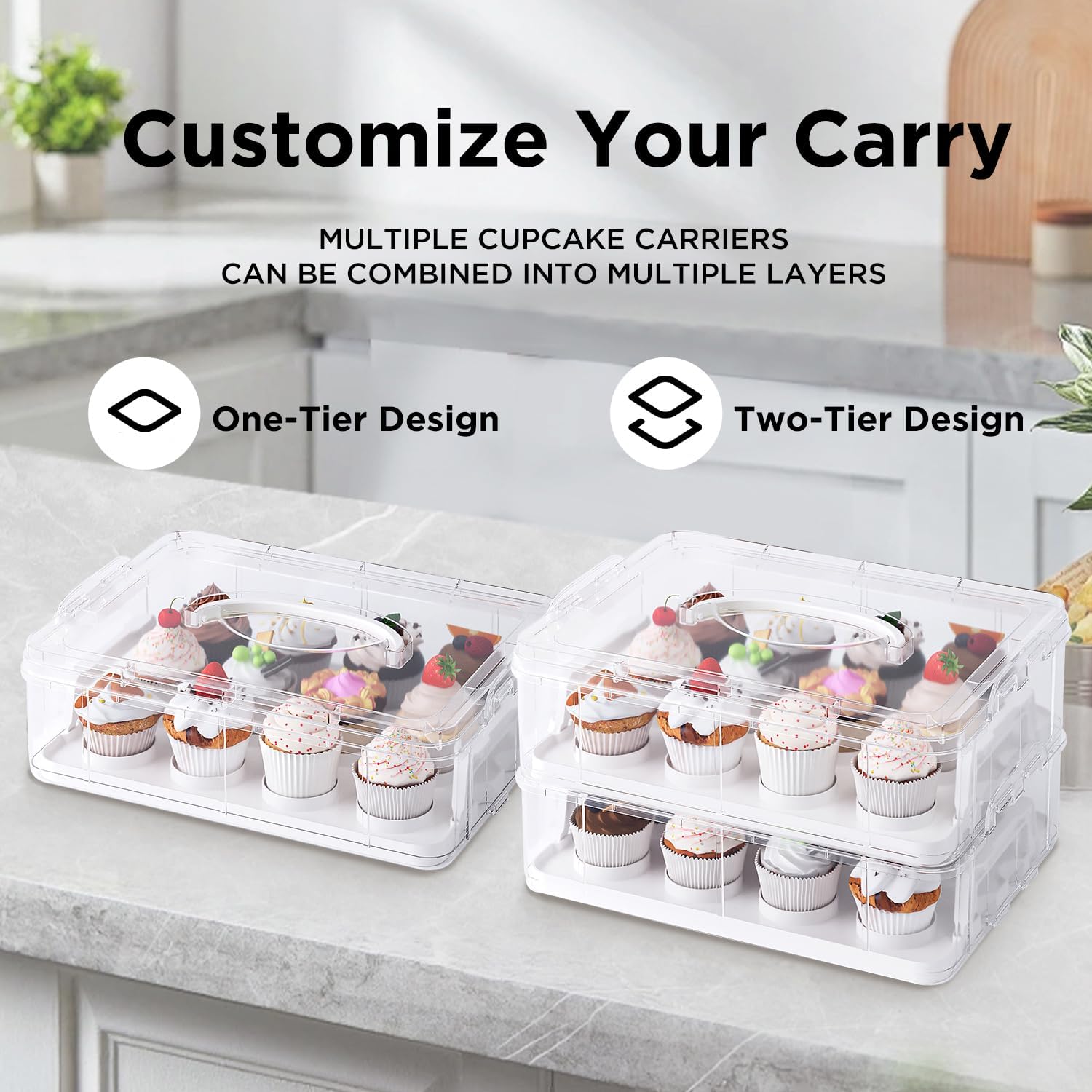 Two Tier Cupcake Carrier, White Stackable Cupcake Holder Carries for 24 Standard-Size Cupcakes, Reusable Detachable Cupcake Box