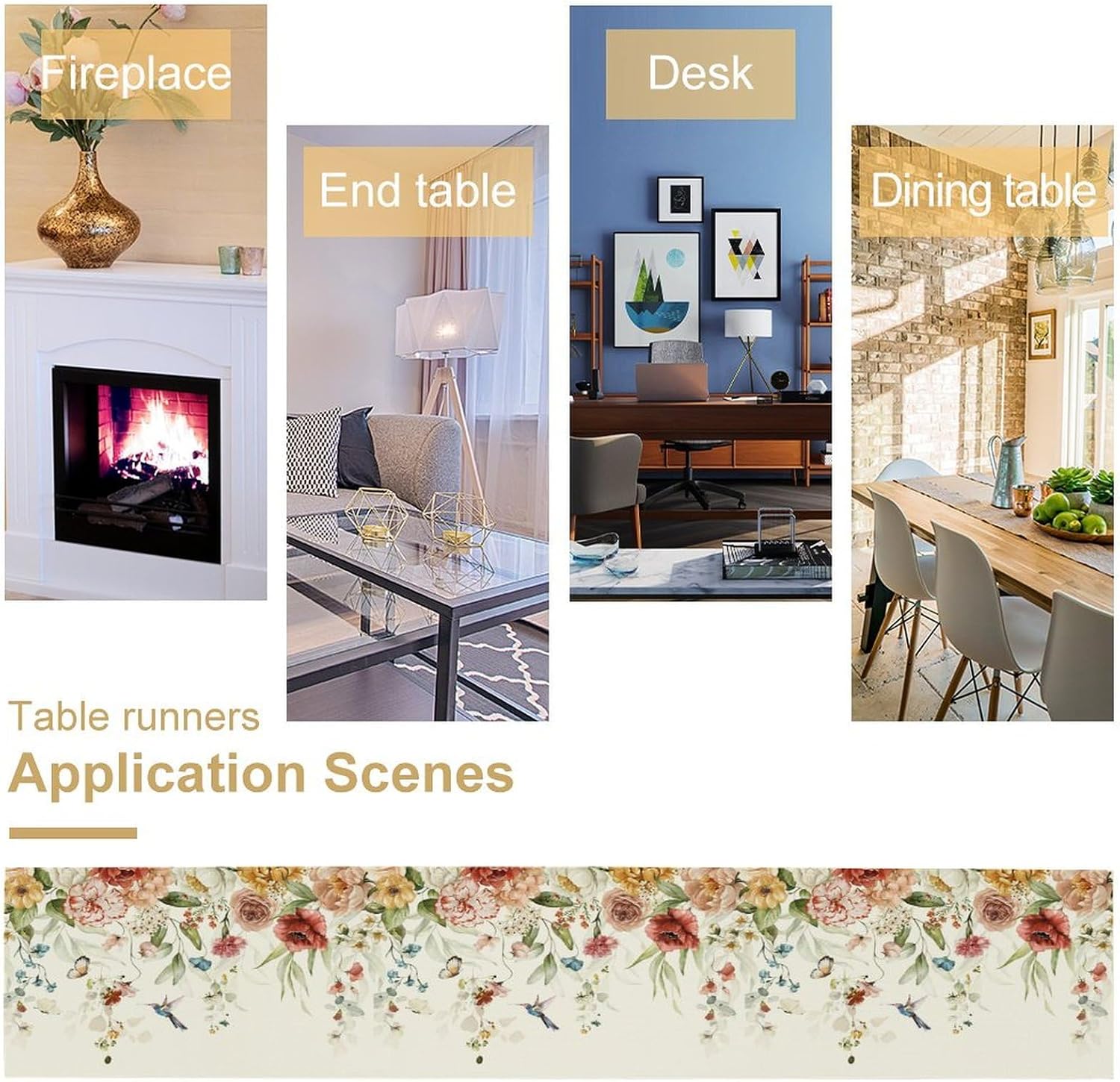 Rustic Floral Table Runner, Watercolor Flower Leaves Hummingbird Butterfly Farmhouse Kitchen Dinning Table Runner for Indoor Outdoor Home Wedding Party Holiday, 13x90 Inch