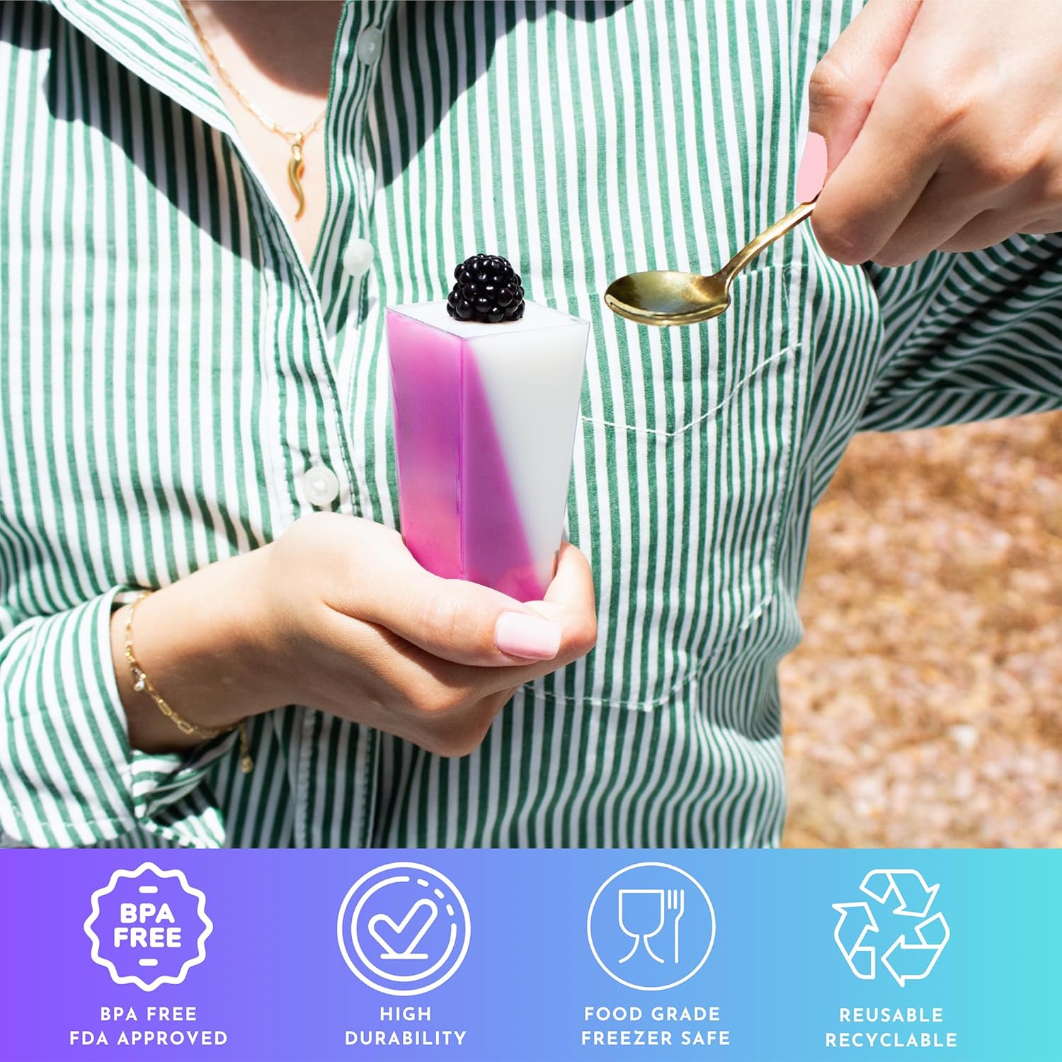 - Versatile Dessert Cups: Our square cake shooters clear plastic dessert cups are perfect for showcasing your favorite treats. These 3oz plastic cups are great as dessert shooter cups, mini shot glasses, mini ice cream containers and more. Our clear plastic cups are an ideal choice for your next party or event.