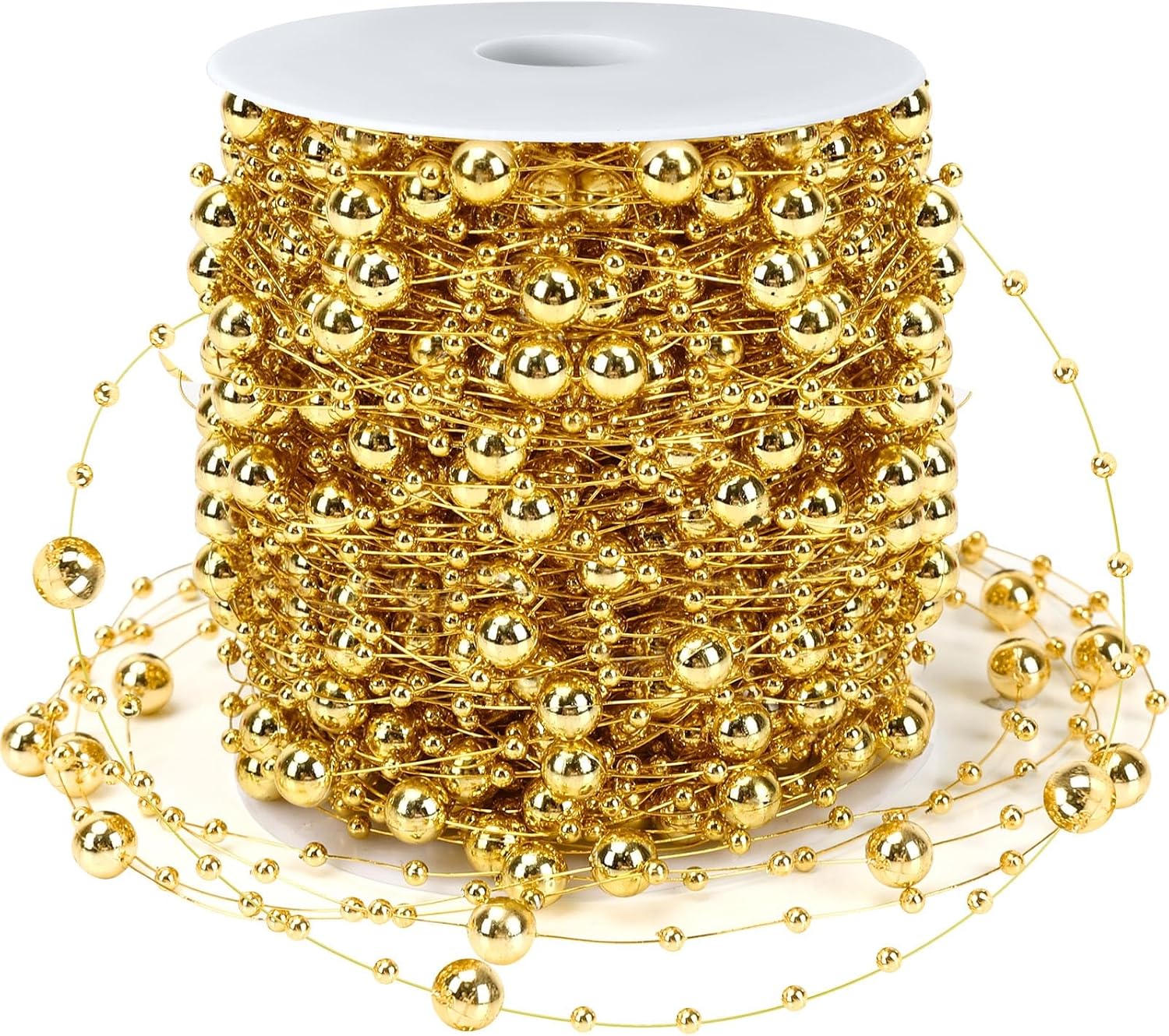 JULBEAR Beads Garland Decoration,1 Rolls 131 Feet Gold Christmas Pearl Strands Chain Bead Garland for Christmas Tree Fireplace Wreath Gift Bouquet Crafts Wrapping Wedding Party Centerpieces Decoration
