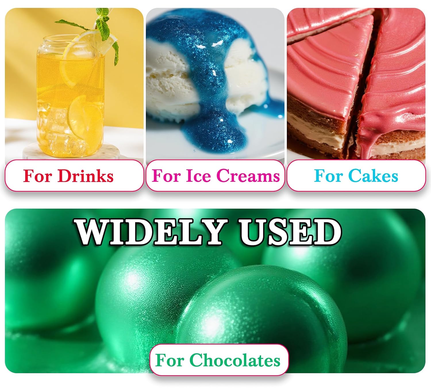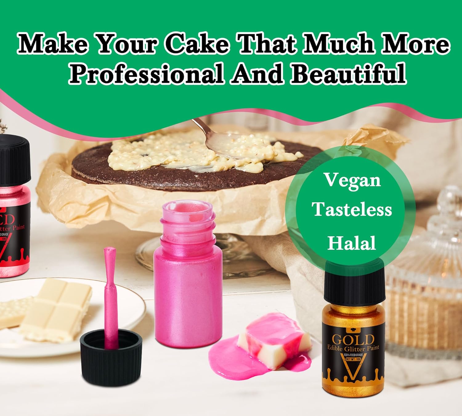 - Brilliant Metallic Effects with Edible Paint: Create stunning high luster finishes on cakes, chocolates, drink and desserts using our edible paint and liquid food coloring. This food safe edible paint delivers brilliant metallic shimmer without altering taste, perfect for professional bakers and DIY enthusiasts seeking a luxurious touch.