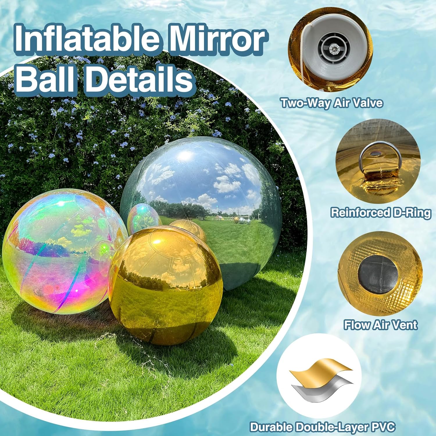 - Multi-Size Mirror Ball: The inflatable ball 3-Piece Set available in silver, gold, iridescent and including multiple sizes can be chosen 19.7in, 23.6in to suit for decoration in variety of occasions.