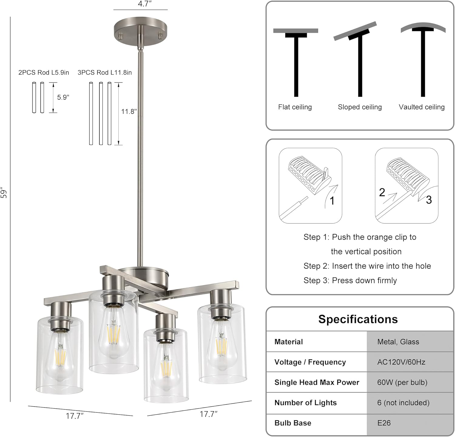 - 【High-Quality & Durable Materials】This brushed nickel Industrial pendant lights is designed to last with a high-grade metal frame (rust and corrosion resistant) and a durable, high clarity glass shade (heat and scratch resistant, easy to clean). Compatible with 4 x 60W max E26 bulbs (not included), it can be used with LED, incandescent, CFL and halogen. Modern kitchen chandelier also compatible with dimmer, you can use a dimmable bulb to create a warm and relaxed atmosphere (Dimmer switch need to buy separately).